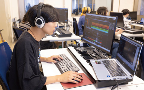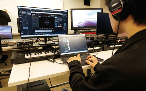 レコーディングスタジオを使い、自身の楽曲アイデアをもとに作品を制作。各授業で学んだ知識などを実践することで音源制作の視野を広げます。