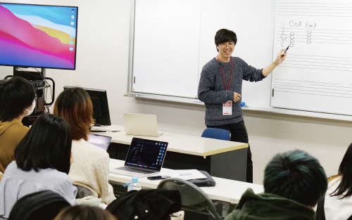 機材操作の最新情報などをはじめ、楽曲コンペティション(コンペ)に関することや企業プレゼンテーションほか、より実践的な内容を学んでいきます。