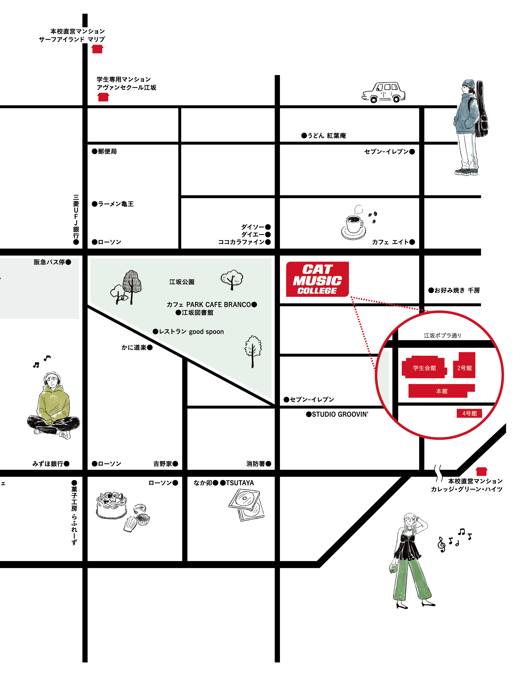 学校周辺は、スーパーやコンビニ、飲食店などの路面店も充実。