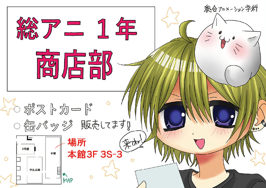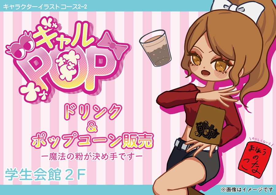キャラクターイラストコース2年2組が、学生会館2Fでドリンク&ポップコーンを販売!