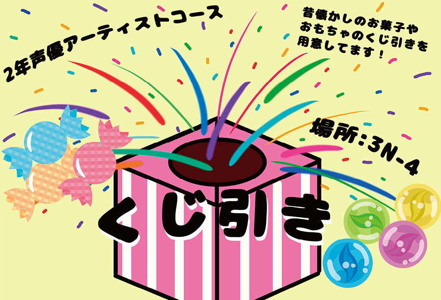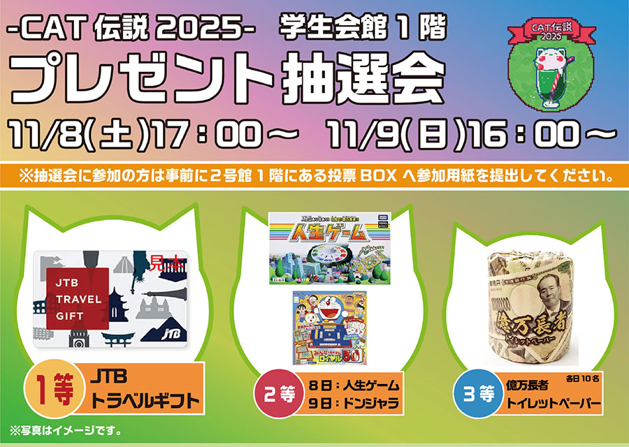 誰でも参加可能なプレゼント抽選会を学園祭の最後に開催します!!抽選会に参加の方は事前に2号館1階にある投票BOXへ参加用紙を提出してください。