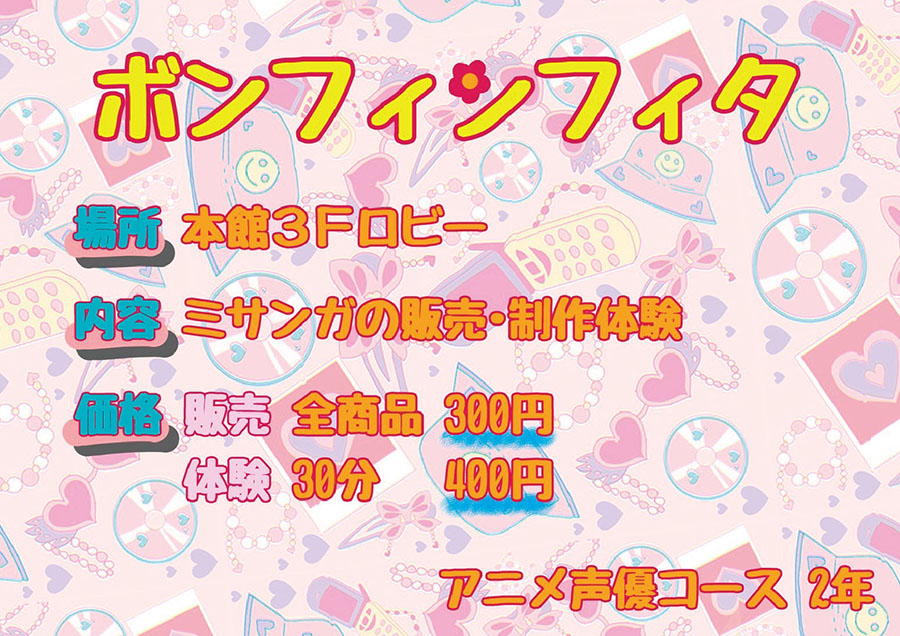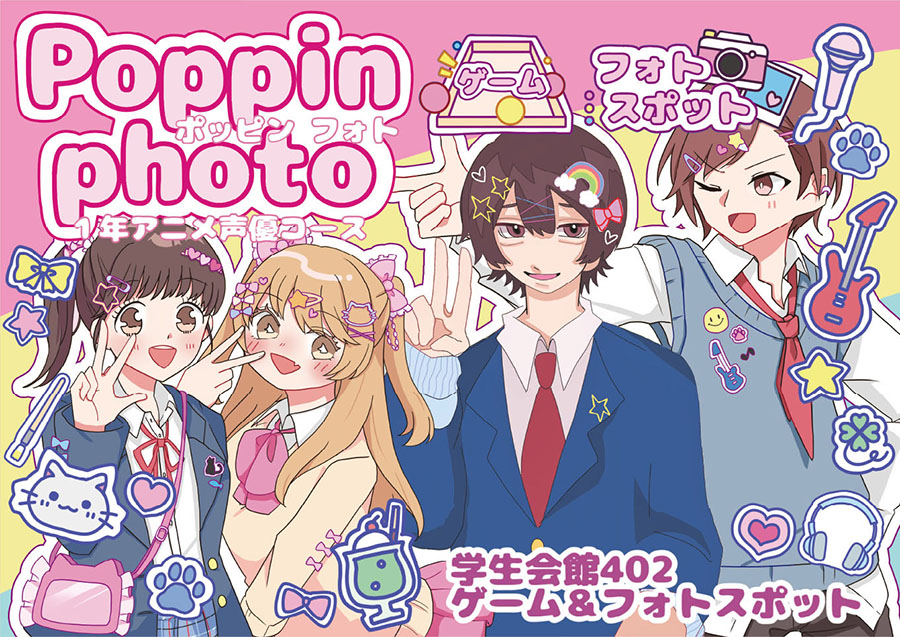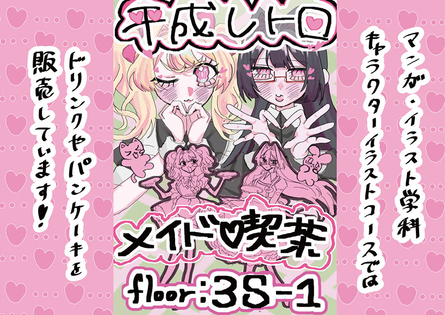 キャラクターイラストコース1-2では『平成ジュースフォトスポット』を学生会館2Fで行います!!「平成ギャル」と「平成文字」がテーマの2つのフォトスポット付きです