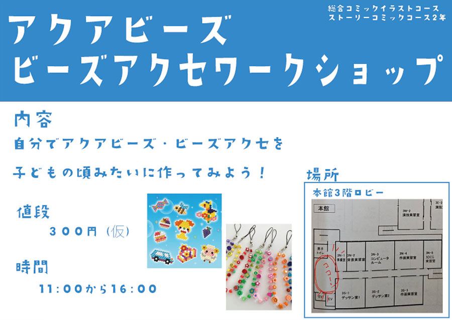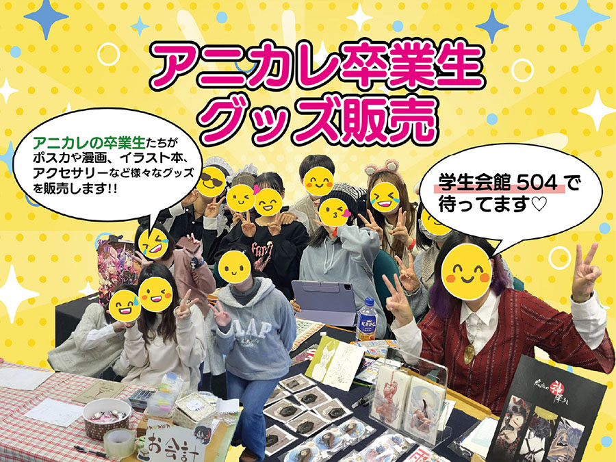 日頃業界で活躍しているアニカレの卒業生がイラストやマンガだけじゃなくアクセサリーやストラップ、小物入れなど素敵なオリジナルグッズを販売します。