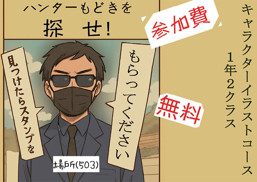 こんにちは。キャラクターイラストコース1年2組、ハンターもどきを探せです。学校内にハンターの格好をした3人が散らばってるので、スタンプをもらってください。