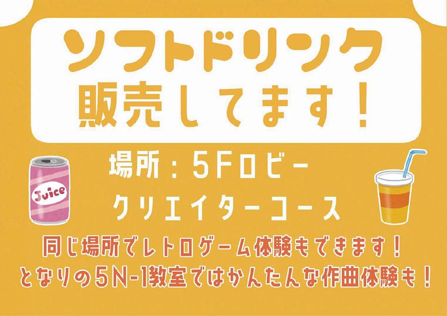 クリエイターコースは5Fロビーにてドリンクを販売しています!ドリンクの種類も豊富で飽きないこと間違いなし!大と小を選べますのでお好きな方をお選びください!