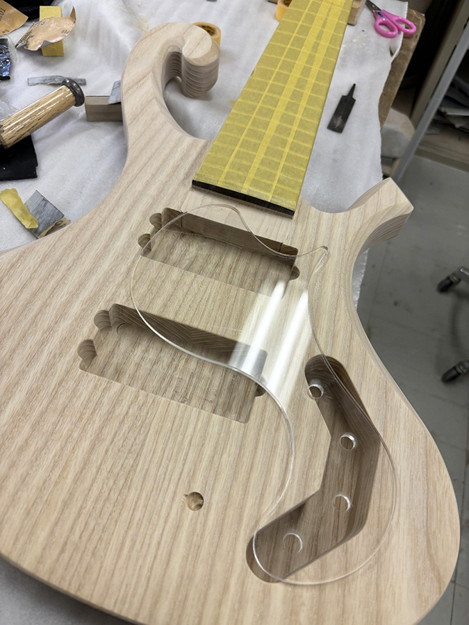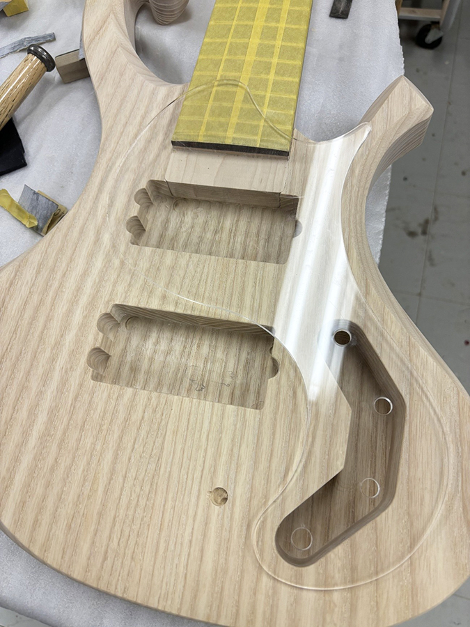 こうしたジグ類はもちろん手作業でも作成できるのですが、ギター一本をオリジナルで作成するとなるとピックガードはもちろん、ボディやネックの型、各種ザグリの型など20~30種類(!!)を作成することになります。