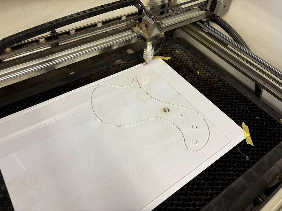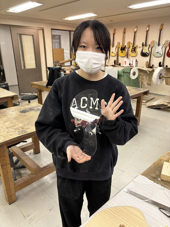 今回は学生が実際に作成している作品(エレキベース)用の、ピックガードマスタージグ(型のようなもの)を作成しました。