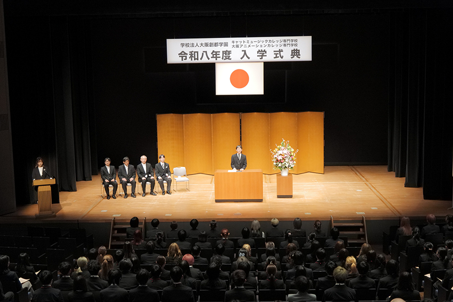 4月2日(火)メイシアターにてキャットミュージックカレッジ専門学校/大阪アニメーションカレッジ専門学校の令和八年度入学式・特待生表彰式がありました。